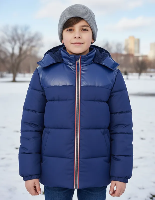 Este abrigo acolchado (Puffer) está diseñado para ofrecer una protección térmica superior sin ser voluminoso, combinando la funcionalidad esencial con un estilo moderno. Aislamiento y Protección Garantizada: El diseño Puffer utiliza un relleno sintético de alta calidad que simula el aislamiento de la pluma, atrapando el calor corporal de manera eficiente para combatir las bajas temperaturas. La capa exterior de Poliéster duradero actúa como una barrera contra el viento y la humedad ligera, haciendo de esta chaqueta una prenda ideal para el invierno, las mañanas frías y los días de lluvia. Características Esenciales para la Comodidad del Niño: Capucha Fija Integrada: El gorro capucha no es desmontable, lo que asegura que la cabeza y el cuello del niño permanezcan cubiertos y cálidos en todo momento, eliminando la preocupación de perder la capucha.
